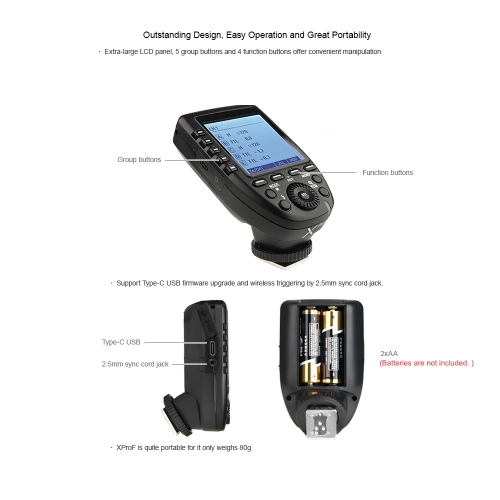 Extra-large LCD panel, 5 group buttons and 4 function buttons offer convenient manipulation. Only weights 80g for great portability. Support Type-C USB firmware upgrade and wireless triggering by 2.5mm sync cord jack.