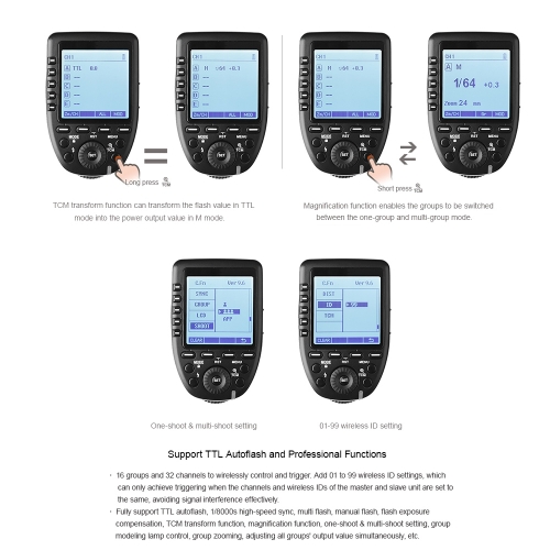 Fully support TTL autoflash, 1/8000s high-speed sync, multi flash, manual flash, flash exposure compensation, TCM transform function, magnification function, one shoot & multi-shoot setting, group modeling lamp control, group zooming, adjusting all groups' output value simultaneously, etc.
