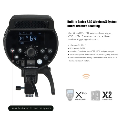 Built-in Godox 2.4G wireless X system with outstanding functions. Using X2 or XPro TTL wireless flash trigger, XT16 or FT-16 remote control to achieve wireless sychronous. (wireless flash trigger and remote control are not included)