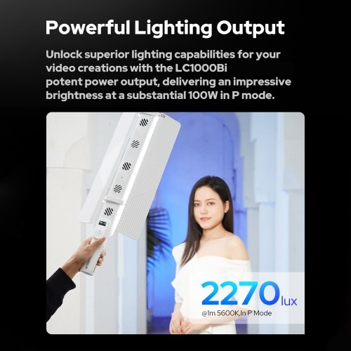 【Powerful Lighting Output & Wide Color Temperature Range】Unlock superior lighting capabilities for your video creations with the LC1000Bi's potent power output, delivering an impressive brightness at a substantial 100W in P mode. With a color temperature range from 2500K to 8500K in CCT mode, the LC1000Bi allows precise adjustments for creating vibrant visuals with customized tones.