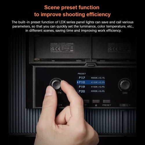 【Scene Preset Function】The 64W bi-color LED video light comes with a built-in scene preset function, which allows you to save and recall various parameters, enabling you to quickly set the brightness and color temperature of the light in different scenes.
