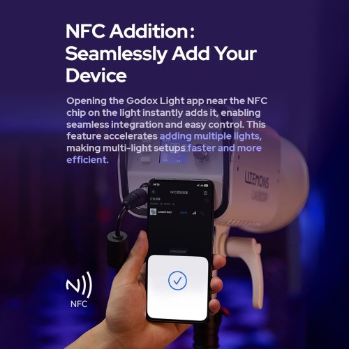 【Seamlessly Add Your Device】Opening the Godox Light app near the NFC chip on the light instantly adds it, enabling seamless integration and easy control. This feature accelerates adding multiple lights, making multi-light setups faster and more efficient.