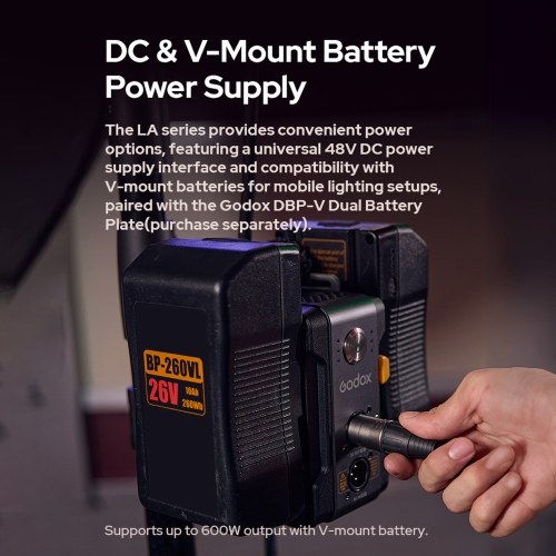 【DC & V-Mount Battery Power Supply】This LED studio light provides convenient power options, featuring a universal 48V DC power supply interface and compatibility with V-mount batteries for mobile lighting setups, paired with the Godox DBP-V Dual Battery Plate(purchase separately).