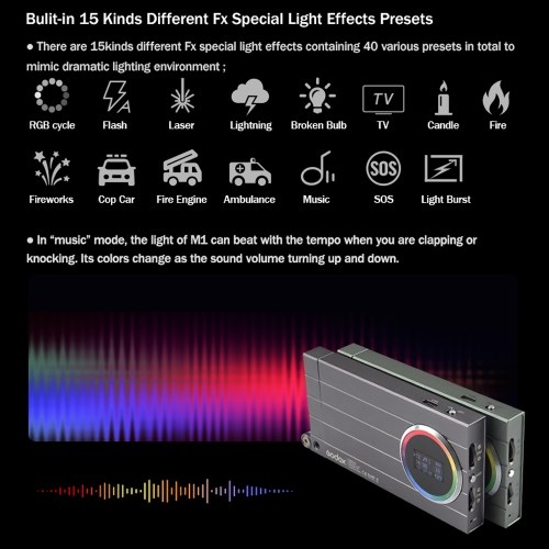 15 Light Effects & 360 Colors: There are 15 kinds of different Fx special light effects containing 40 various presets in total to mimic dramatic lighting environment. Also the RGB light color are 360 full colors adjustable.