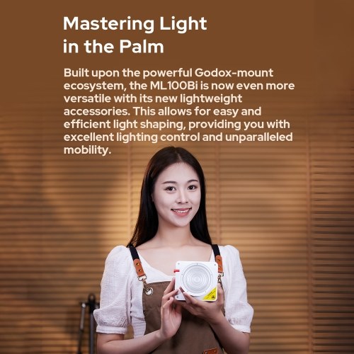 Mastering light in your hand, the ML100Bi offers excellent versatility and performance. Weighing only 487g, its easy installation and mobility are matched by its strong input power of 120W. As part of the Godox-mount ecosystem, the ML100Bi, paired with a wide range of Godox-mount accessories, enables precise lighting control. With a pocket-sized design, it's perfect for on-the-go photography. Its diverse power options ensure extended working time and emergency backup. Backed by exceptional color reproduction with TLCI 98+ and CRI 97+, it delivers lifelike visuals for all your creative projects.