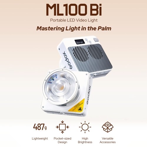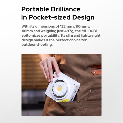 【Pocket-sized Design & APP Control】With its dimensions of 122mm x 110mm x 46mm and weighing just 487g, the ML100Bi epitomizes portability. Its slim and lightweight design makes it the perfect choice for outdoor photography. Easily adjust brightness and effects using the light body controls or the "Godox Light" APP.