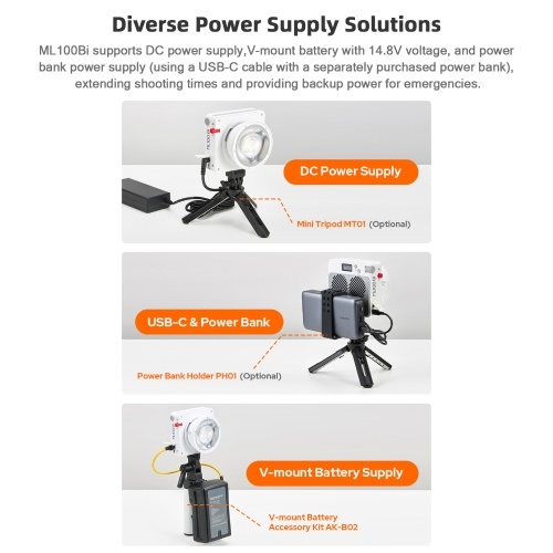 【Diverse Power Supply Solutions】ML100Bi supports DC power supply(included), V-mount battery with 14.8V voltage(not included), and power bank power supply (using a USB-C cable with a separately purchased power providing backup power for bank), extending usage times and emergencies.