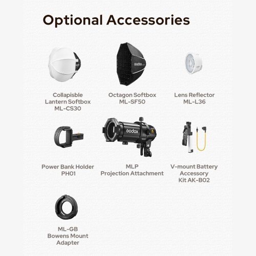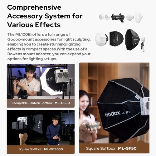 【Comprehensive Accessory System for Various Effects】The ML100Bi offers a full range of Godox-mount accessories for light sculpting, enabling you to create stunning lighting effects in compact spaces.With the use of a Bowens mount adapter, you can expand your options for lighting setups.