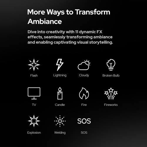 【Unique Lighting Effects】Unleash your creativity with the COB lamp's 11 distinctive FX lighting effects. These effects allow you to replicate various real-life scenarios, adding depth and authenticity to your photography or videography projects.
