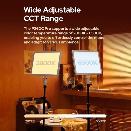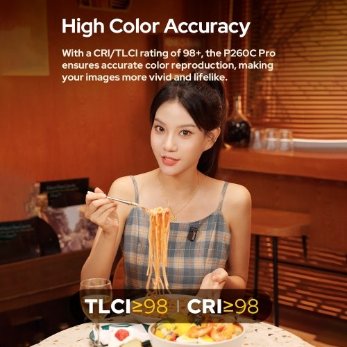 【Wide Adjustable CCT Range】The P260C Pro supports a wide adjustable color temperature range of 2800K - 6500K, enabling you to effortlessly control the mood and adapt to various ambience. With a CRI/TLCI rating of 98+, the P260C Pro ensures accurate color reproduction, making your images more vivid and lifelike.