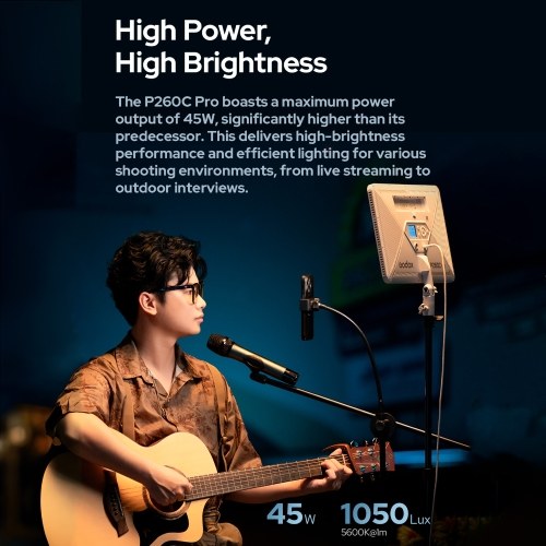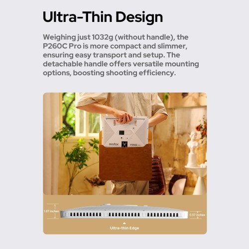 【High Power & High Brightness】The P260C Pro boasts a maximum power output of 45W, delivering high-brightness performance and efficient lighting for various usage environments, from live streaming to outdoor interviews. Weighing just 1032g (without handle), more compact and slimmer, easy transport and setup. The detachable handle offers versatile mounting options.