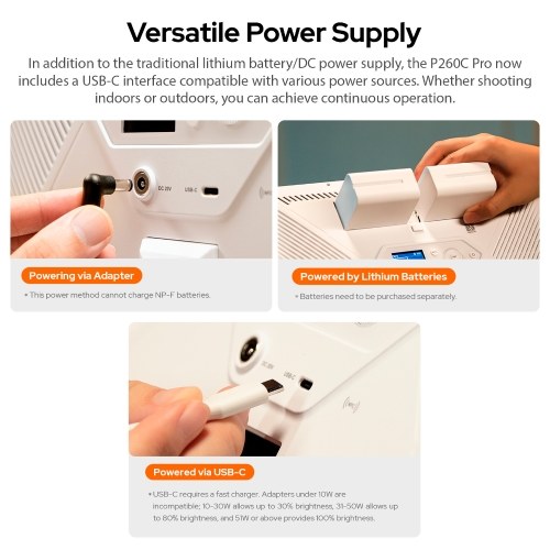 【Versatile Power Supply】In addition to the traditional lithium battery/DC power supply, the P260C Pro now includes a Type-C interface compatible with various power sources. Whether indoors or outdoors, you can achieve continuous operation.