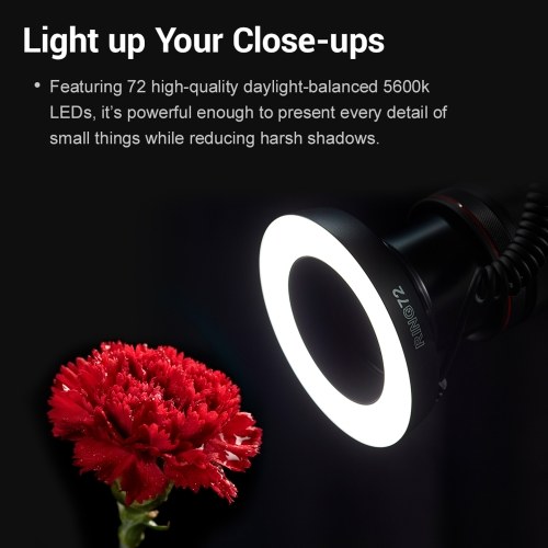 A mini ring light with 72pcs high-quality LED beads, color temperature 5600K, 10 levels of adjustable brightness, and controller, which can control the left and right half of ring light separately, specially designed for macro photography, perfect for plant photography, insect photography, portrait, etc.