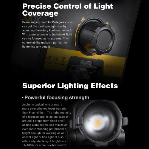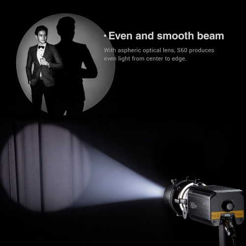 【Powerful Focusing Strength】Aspheric optical lens grants S60Bi a more strengthened focusing ratio than Fresnel light, and produces even light from center to edge. Bright enough for working as an accent light or hair light. It offers adjustable light brightness from 1%-100% for more flexible usage.