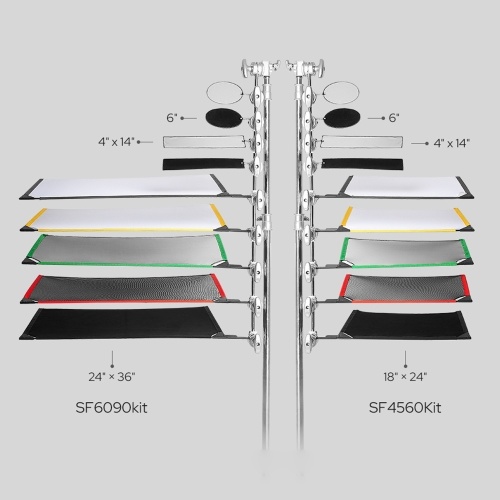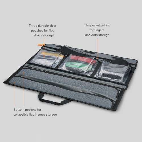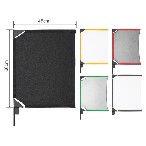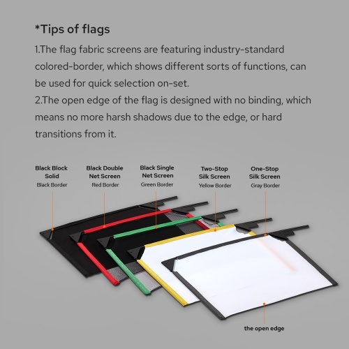 【A Versatile and Portable Light Modifying Kit】With 5 flag frames and fabric screens to assemble flags for shaping, blocking or diffusing the light, as well as 2 groups of fingers and dots to allow more precise adjustments of light. Having the Godox Scrim Flag Kit offers you a versatile complete lighting modifying solution, with easier access to finer tuned lighting whenever you need it. 【High Control of Lighting Effect】The scrim flag kit could help the photographers to easily adjust the contrast of the light and dark areas of the subject, so as to realize more even or accented pictures in a precise and convenient way, and for you to take high control of lighting effect. It also releases you from the limitation of space and time, making it easier to set the scene you desire. 【Fingers and Dots】The dots and fingers in black net and solid fabrics allow you to shape light just like the flags of black net and solid, but on smaller objects or areas. They are ideal for tabletop photography or in situations where the larger fabrics are inconvenient. 【Tips of Flags】The flag fabric screens are featuring industry-standard colored-border, which shows different sorts of functions, can be used for quick selection on-set. The open edge of the flag is designed with no binding, which means no more harsh shadows due to the edge, or hard transitions from it. 【Portable and User-friendly】The well-designed carrying bag has more than enough room for quick organization and storage. It also has an ergonomic handle for you to carry around the package in a more comfortable way. This neat user-friendly carry bag definitely makes the kit more of a convenient and portable solution, leaving you no reason to refuse it.