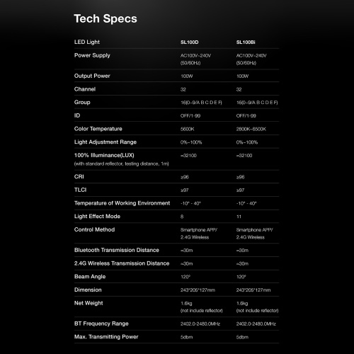 【Compact Unit with High Brightness】Compact light body, more flexible to use in small studios; with a powerful 32100 lux surprising brightness at 1 meter, SL100Bi can be the only lights you need for a simple studio on a budget solution.