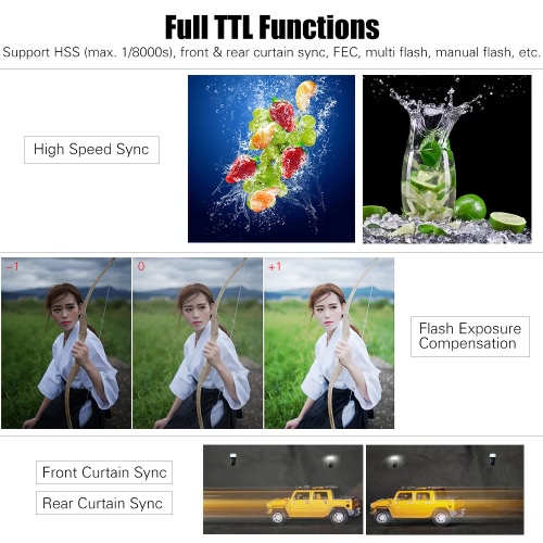 Full support E-TTL functions, supports HSS (max. 1/8000s), front & rear curtain sync, FEC, multi flash, manual flash, etc.