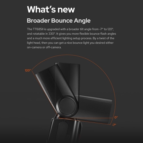Manual Zoom: Swinging/ tilting flash head (bounce flash): 0-330°horizontally and -7°-120° vertically