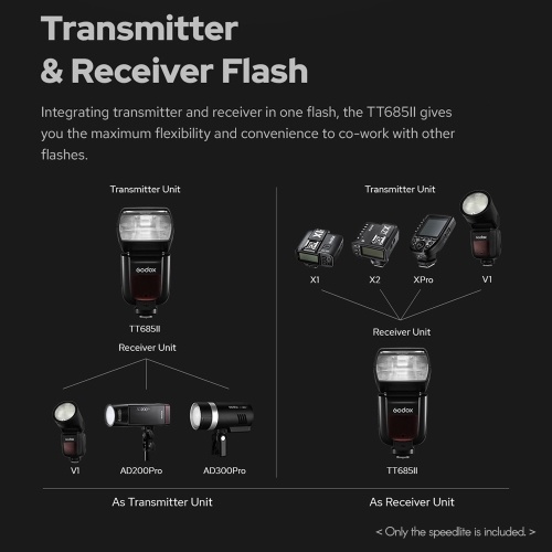 [High-Quality Speedlite] 1/300s-1/20000s flash duration, guide number ≈60 ISO 100, with charging port, improving flash performance, shortening recycle time, and extending working time.