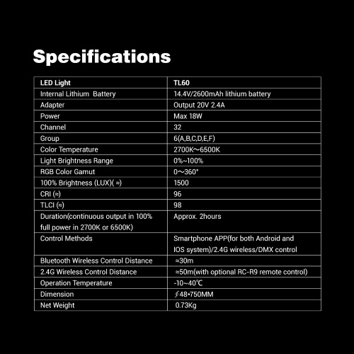 RC-R9 remote control(not included), smartphone APP control or DMX control. Equipped with built-in battery and comes with AC power adapter, TL60 supports flexible and continual power supply for different shooting scenes.