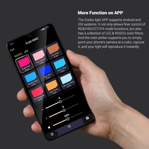【More Function on APP】The Godox light APP supports Android and iOS systems. It not only allows finer control of HSI/CCT/FX mode functions, but also has a collection of LEE & ROSCO color filters. And the color picker supports you to simply point your phone's camera at a color, capture it, and your light will reproduce it instantly.