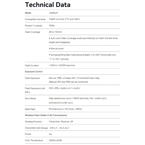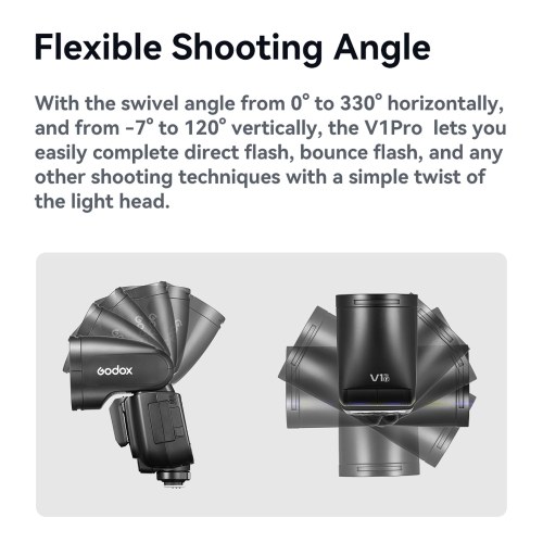 【Flexible Shooting Angle】With the swivel angle from 0° to 330° horizontally, and from -7° to 120° vertically, the V1Pro lets you easily complete direct flash, bounce flash, and any other shooting techniques with a simple twist of the light head.