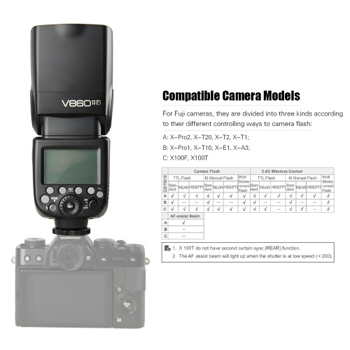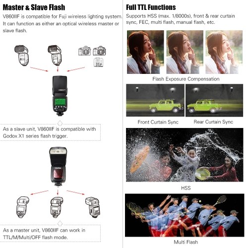 As a master unit, V860IIF can work in TTL/M/Multi/OFF flash mode. As a slave unit, V860IIF is compatible with Godox X1 series flash trigger.