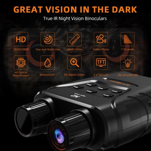 Enhanced Visibility in Darkness: Digital night vision binoculars provide professional-grade visibility in complete darkness, featuring an HD screen and up to 1080p video resolution for clear viewing.