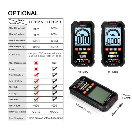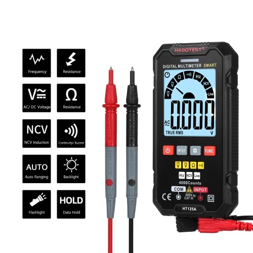[Auto Recognition/ Manual Selection] High accuracy, wide measuring range, 4000 counts, auto recognition or manual selection. It can test AC voltage, DC voltage, resistance, frequency and continuity. And HT125B can also test capacitance and diode.