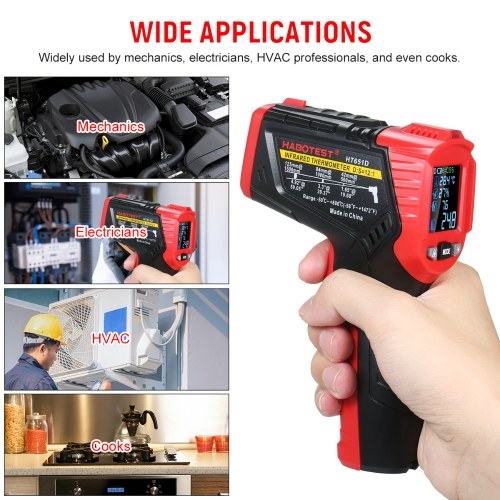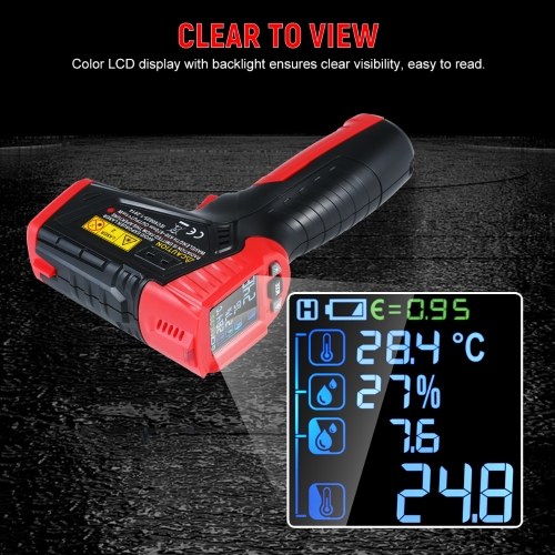 The HABOTEST Infrared Thermometer takes non-contact/contact temperature and humidity measurement. This is an efficient and long lasting all-purpose IR thermometer, which is great for measuring hot objects at a safer distance to monitor electrical, mechanical, HVAC, automotive systems and kitchen appliance. It works on a 9V batttery and features an color LCD display, adjustable emittance, 12:1 distance-to-spot ratio, K-type thermocouple, mildew alarm, data hold, auto off, switchable degree Celsius/Fahrenheit.