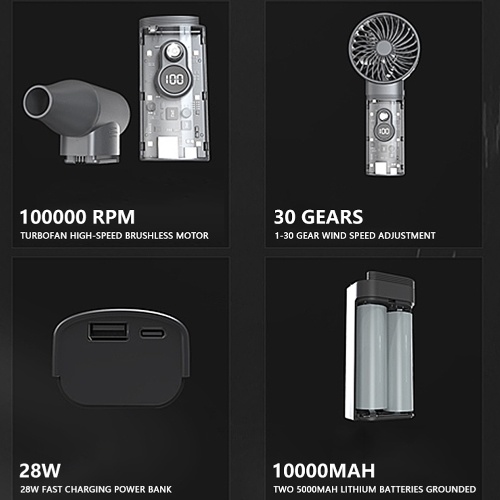 This fan is simple in design, reasonable in structure, and stable in performance, customized for narrow spaces, with wide application scenarios. Adopting a brushless high-speed motor that reaches up to 100,000 RPM rotation speed, this device offers surging power and durability, providing a perfect dust removal effect. Multiple wind speeds can be adjusted at will to meet the power requirements of different tasks. Suitable for carbon fire blowing, woodworking chip blowing, industrial dust blowing, soot blowing, snow blowing, keyboard cleaning, car center console/engine/crevice/foot mat crumb cleaning, barbecue combustion, fan cooling, airbeds inflating, etc.