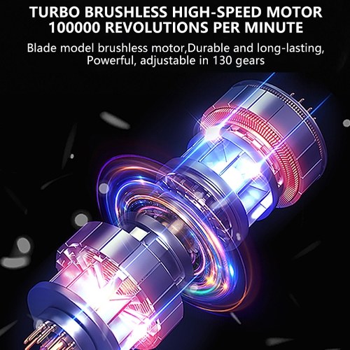 【100,000 RPM Brushless Motor】: Adopting a brushless high-speed motor that reaches up to 100,000 RPM rotation speed, this device offers surging power and durability, providing a perfect dust removal effect. Multiple wind speeds can be adjusted at will to meet the power requirements of different tasks.
