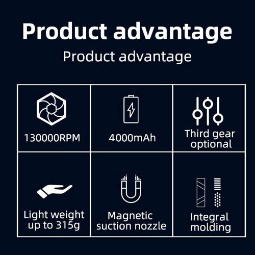 【Brushless Motor & Strong Wind】: Adopting a low-noise and high-speed brushless motor, the maximum output speed is up to 130,000rpm and can continuous output of surging power, even under long-time high load operation can ensure that no heat, no burning, and stable operation, to extend the service lifespan. Strong wind design, one button on/off, simple and convenient to operate, providing perfect dust removal effect.