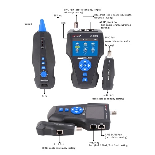 Testing Device Interface: Main unit: RJ45(M), RJ45(S), POE/PING, RJ11, BNC ports. Remote identifier: RJ45, RJ11, BNC ports