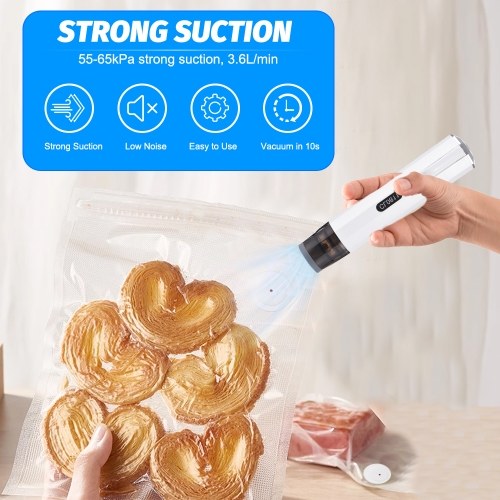 【Efficient Vacuuming】: The handheld vacuum sealer features a powerful 3.6L/min suction rate, allowing you to quickly and effectively remove air from food bags or cans. With a vacuum pressure of 55-65kPa, it ensures a tight seal and extends the shelf life of your food.