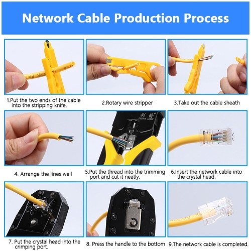 This tool kit includes a crimping pliers, network cable tester, wire stripping cutter, flat /cross screwdriver, stripping pliers cutter, punch-down tool and RJ45 connectors.