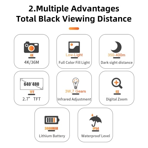 Built-in a high-sensitivity sensor, high-clear night vision binoculars achieve 4K FHD video resolution and 36MP photos. 850NM infrared LEDs are designed to illuminate everything nearby. The display design of the binoculars allows you to experience the 3D real-time observation effect in an immersive, recording of audio and video. The lightweight and compact design of our infrared night vision telescope makes it easy to carry and use on the go. From mesmerizing wildlife encounters to exhilarating night-time adventures, our device empowers you to preserve memories in unrivaled clarity.