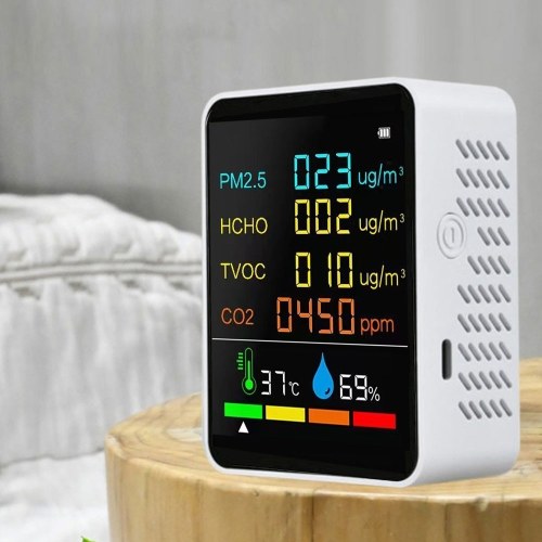 Large LCD color display with backlight, you can see the electricity quantity, CO2 value, TVOC value, HCHO value, temperature, and humidity clearly.