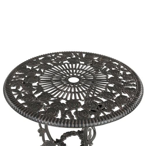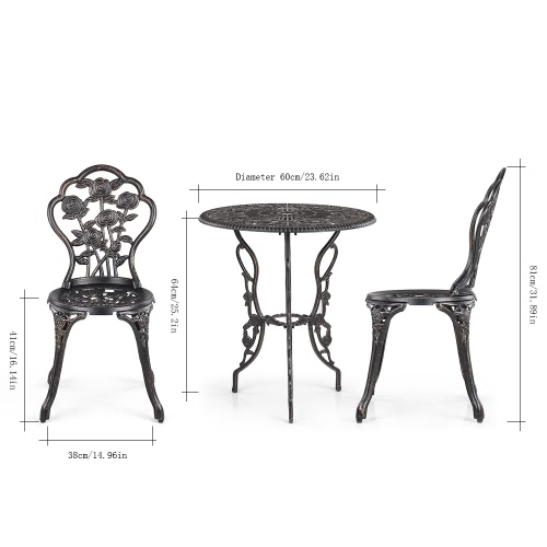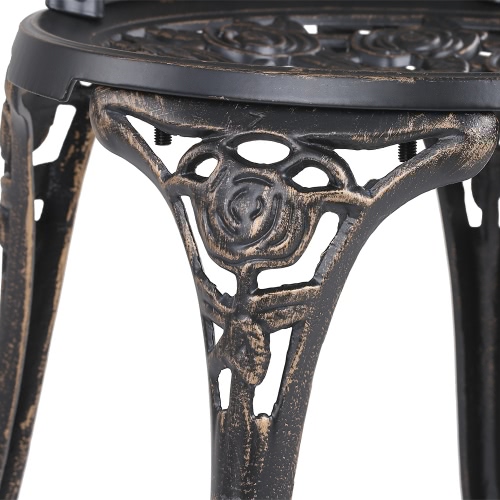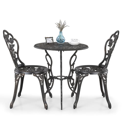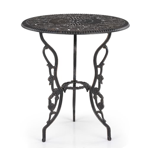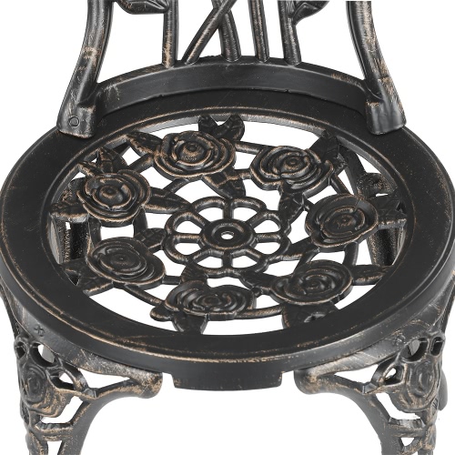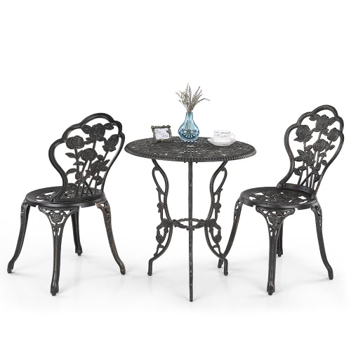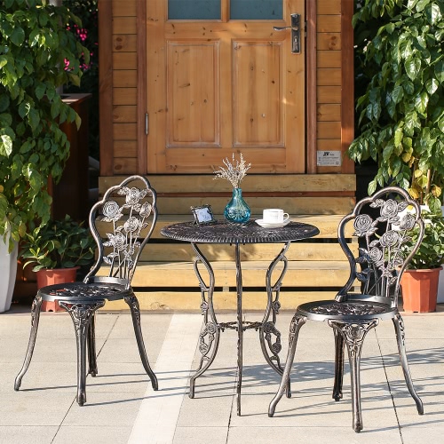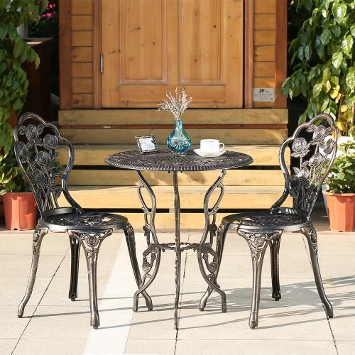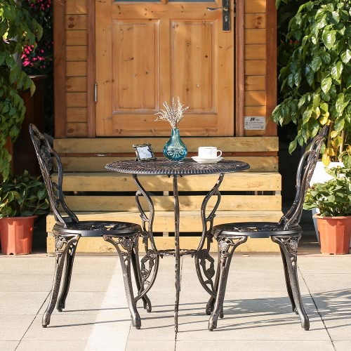 This little bistro set is absolutely gorgeous, we love it for our porch. There are a few sharp edges on it though in certain areas but nothing too drastic. It is a brilliant white colour which goes perfectly with our newly painted house. We do have it sitting on a open but covered porch which does protect it from the elements a bit. Could possibly rust if gets wet often. Love sitting at this in the morning with a nice cup of tea. Well worth the money and we are considering a bench in the same style.
