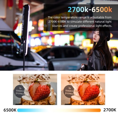 【2700K-6500K Bi-color Temperature】Equipped with 12W full spectrum LED beads with a high color rendering index of 95+, the light stick offers adjustable color temperature ranging from 2700K to 6500K to simulate various natural light sources for professional lighting effects. With 0.96-inch color screen to display the working status and light modes.