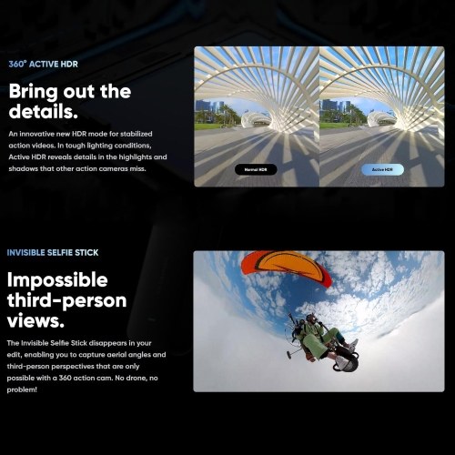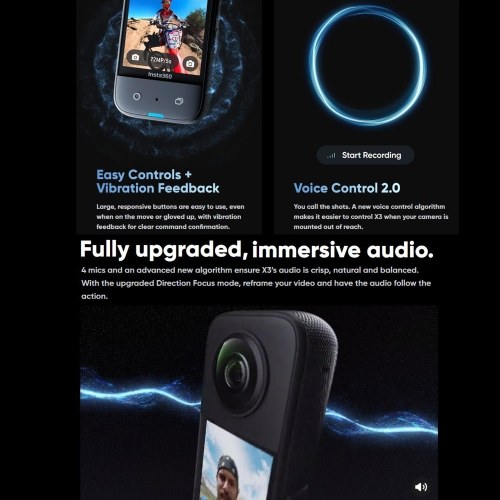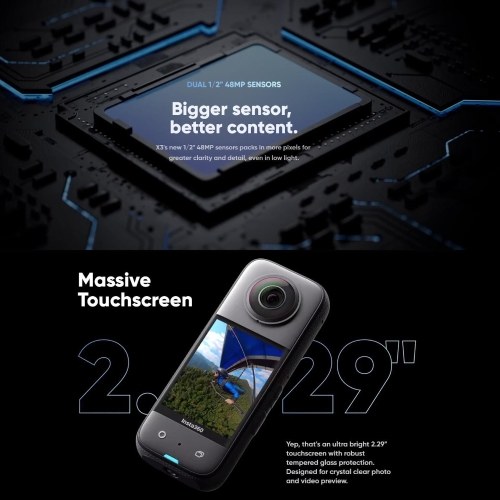 【5.7K 360° Video & 72MP 360° Photos】With dual new 1/2 inch 48MP sensors, X3 captures vivid 5.7K 360° video and 72MP 360°photos with more detail than ever before. You will never miss the action. With 360 degrees of footage at your fingertips. You can use easy reframing tools in the AI-powered Insta360 APP and share to any social media platform in a tap without losing any quality. 【4K First-person Views & See Yourself at 60fps】Select a lens to record wide-angle footage just like a single-lens action camera. Get maximum resolution with 4K/30fps or an extremely 170° wide field of view with 2.7K max. resolution. Your first-person view footage has never looked so good. Try the all-new Me Mode, which fixed the frame to focus only on you. Capture yourself without the selfie stick at 60fps for epic slow motion. No need to reframe, just keep yourself in frame. 【360° Active HDR mode & 360°Horizon Lock】An innovative new HDR mode for stabilized action videos. In tough lighting conditions, Active HDR reveals details in the highlights and shadows that other action camera miss. Unlock the next level of action camera image stabilization. Whether you are flipping on your paraglider or riding a roller coaster, 360° Horizon Lock function always keeps your video level. 【Impossible Third-person Views & Steady No Matter What】The invisible selfie stick(not included) disappears in your edit, enabling you to capture aerial angles and third-person perspectives that are only possible with a 360 action camera. Bumpy trails and big waves are no match for X3's leading action camera image stabilization. FlowState stabilization function keeps your videos smooth no matter what. 【Speed Up Time in Glorious 8K & Supports 4K 120fps Slow Motion】Take next-level 360° timelapse videos in eye-popping 8K quality, thanks to X3's larger new sensor. Supports 4K 120fps or 3K 180fps slow motion, which looks more cinematic than ever with higher resolution and frame rates. 【Looping Recording & Waterproof Action Camera】Turn X3 into a dashcam. It will continually record video but only save the final minutes according to your set interval, saving precious space on your memory card. Take X3 down to 10m/33ft straight out of the box. Grab the Dive Case(not included) for seamless stitching of your underwater 360° footage down to 50m/164ft.