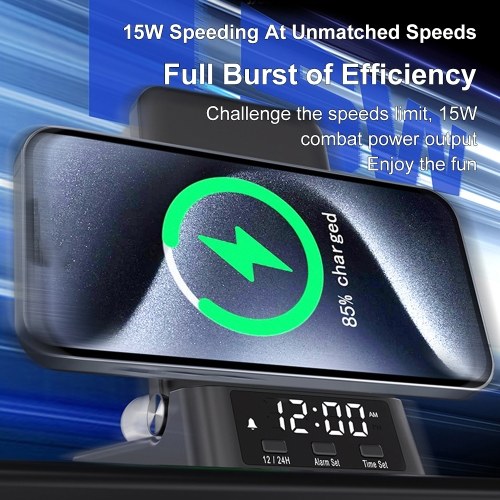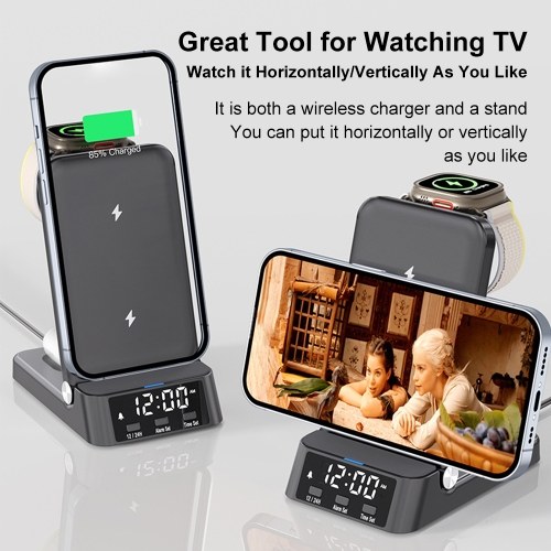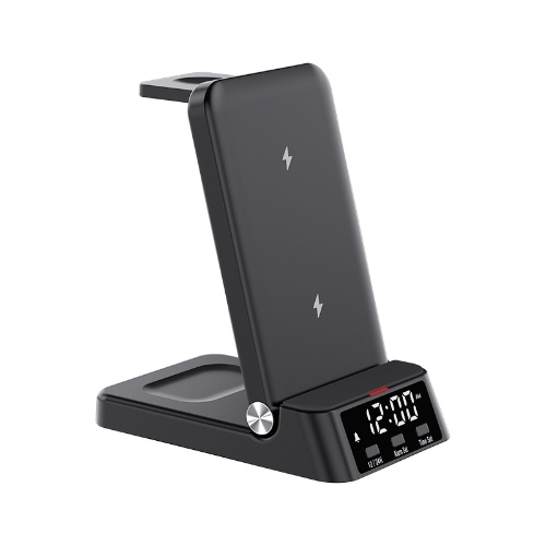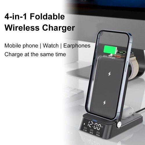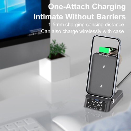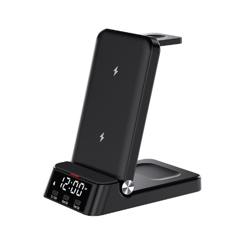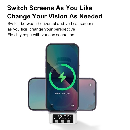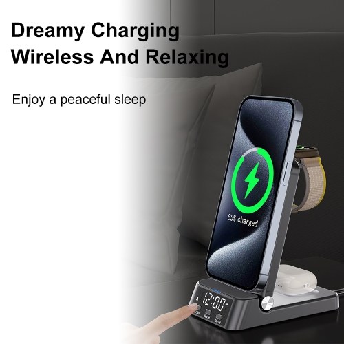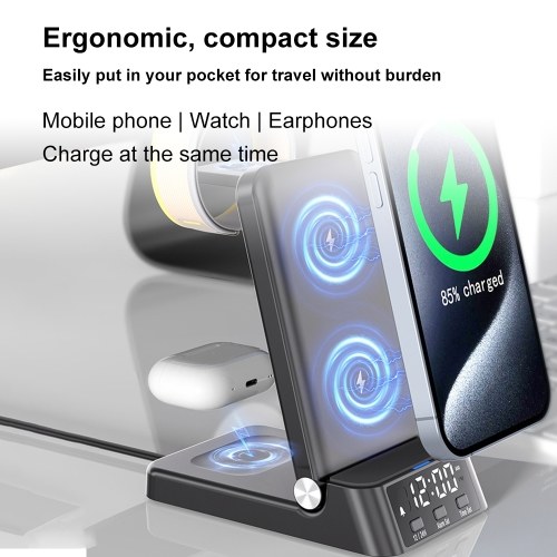 The strong magnetic design allows you to easily hold your smartphone. With a high-clear clock design, you can easily set the time or alarm. A smart indicator light makes it easy to check the charging status. Its soft glow provides clear information without disturbing your sleep. Compact about the size of a mobile phone folds flat to easily fit into a bag. This wireless charging station for multiple devices won't occupy much space, and it is excellent for offices, homes, or trips to save on wire clutter.