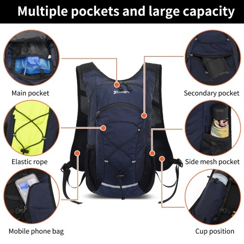 Breathable mesh on the back fabric can reduce sweating for extra comfort. Our backpacks are designed so that you can lighten the burden on your back during a hiking or a trip. The reflective design also increases visibility, making it safer at night. This hydration backpack comes with a 2-liter water bladder & bilateral hose outlets designed to free your hands. The small hiking backpack features multiple compartments and an anti-theft zipper to stop important documents and items from being stolen. A very practical shoulder bag for hiking, biking, camping, skiing, running & mountaineering.