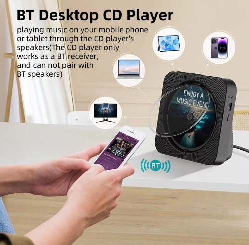 BT Desktop CD Player: playing music on your mobile phone or tablet through the CD player's speakers. (The CD player only works as a BT receiver, and can not pair with BT speakers.)