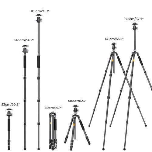 【Flexible to Adjust Usage Height】4 sections tube leg and the max diameter is 25mm; the tripod legs supports 3 levels of opening angle for low angle photography; The height without column reaches 141cm/55.5in and the height with center column is 172cm/67.7in.