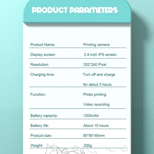 Durable Battery and Included Consumables: The camera features an 1200mAh built-in lithium battery, offering up to 10hrs of shooting time. The package also includes 3 rolls of consumables, ensuring uninterrupted printing of your child's favorite memories.