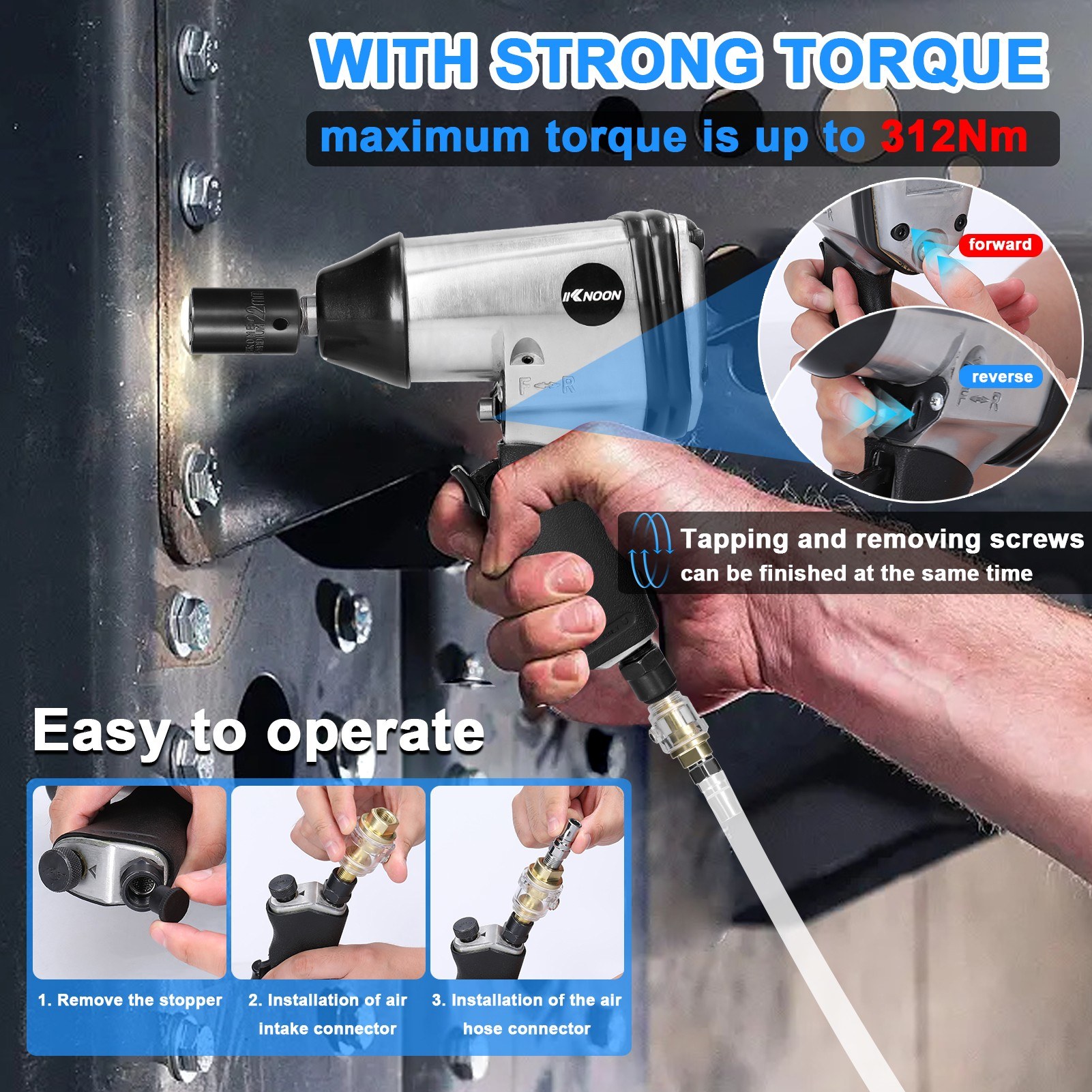 This is a kind of quality pneumatic wrench, which is made of high-precise machining and heat-treated processing, with high strength, impact resistance, and outstanding durability. With strong torque, the maximum torque is up to 312N.m, tapping and removing screws can be finished at the same time. Multi-purpose, suitable for a variety of scenarios, easy to handle all kinds of working conditions, suitable for car disassembly, workshop assembly, industrial maintenance, mold installation, etc.