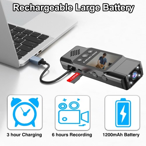 Large Capacity Battery: With a built-in 1200mAh large capacity battery, this body cam supports long time audio and video recording sessions. The included type-C charging cable enables convenient recharging for uninterrupted use.