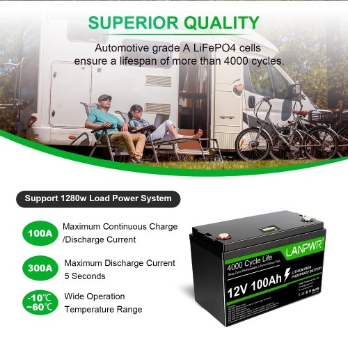 LANPWR 12V 100Ah batteries are manufactured by Automotive Grade LiFePO4 Cells with higher energy density, more stable performance, and greater power. With no acid in the battery, you're able to safely mount it in any position. LiFePO4 batteries can be recycled and do not produce elements that are harmful to the environment, but lead-acid batteries pollute the environment.