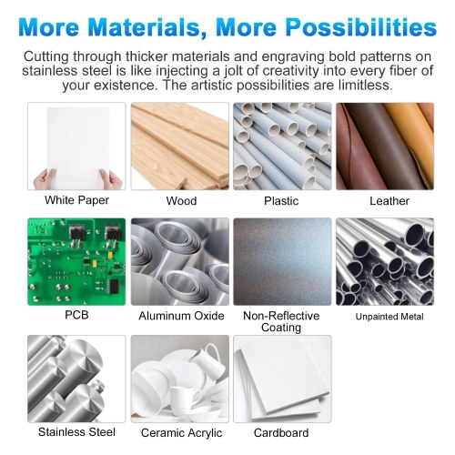Application Materials: White paper, wood, cardboard, plastic, leather, PCB board, aluminum oxide, non-reflective coating, unpainted metal, stainless steel, ceramic, acrylic, etc.